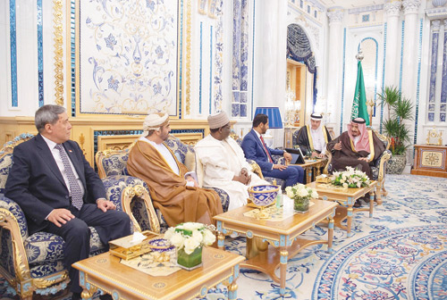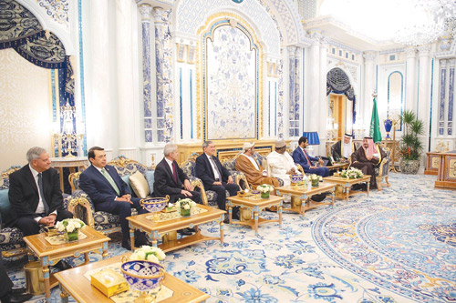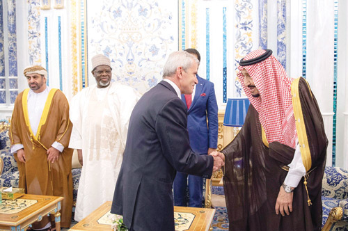 استقبل خادم الحرمين الشريفين الملك سلمان بن عبدالعزيز آل سعود -حفظه الله- في مكتبه بقصر السلام في جدة أمس، عميد السلك الدبلوماسي سفير جمهورية جيبوتي لدى المملكة ضياء الدين سعيد بامخرمة، ورؤساء المجموعات الدبلوماسية المعتمدين لدى المملكة وهم كل من سفير الكاميرون رئيس المجموعة الإفريقية إياد تيجاني، وسفير سلطنة عمان رئيس المجموعة العربية أحمد بن هلال البوسعيدي، وسفير سنغافورة رئيس المجموعة الآسيوية لورانس أندرسون، وسفير ألبانيا رئيس المجموعة الأوروبية سامي شيبا، وسفير المكسيك رئيس مجموعة أمريكا الشمالية خوان ألفريدو أورتيز، وسفير الأورغواي رئيس مجموعة أمريكا الجنوبية كارلوس بنتاكور، وسفير نيوزيلندا رئيس مجموعة أوقيانوسيا جيمس مونرو.