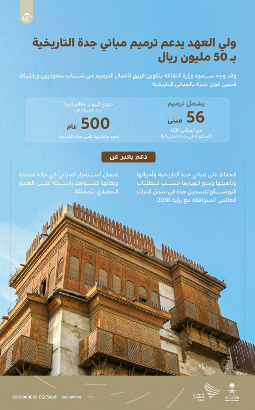 وأكد أمير منطقة مكة المكرمة «أن هذا الدعم من سمو ولي العهد يأتي للحفاظ على مباني جدة التاريخية، وإعادة تأهيلها بما يتوافق مع رؤية المملكة 2030، للحفاظ على الهوية الثقافية، والحضارية في بلادنا الغالية، ويعكس اهتمام حكومتنا الرشيدة بقيادة سيدي خادم الحرمين الشريفين -رعاه الله-، وسموكم الكريم لمسيرة التطور والنماء في كافة المجالات».