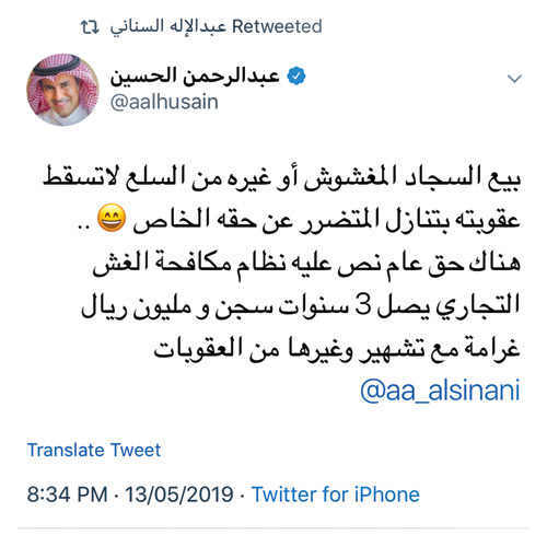 أوضح المتحدث الرسمي لوزارة التجارة والاستثمار عبدالرحمن الحسين، أن عقوبة بيع السلع المغشوشة لا تسقط بتنازل المتضرر عن حقه الخاص، موضحا في تغريدة على حسابه الرسمي في «تويتر» أن هناك حق عام ينص عليه نظام مكافحة الغش التجاري تصل العقوبات فيه إلى 3 سنوات سجن ومليون ريال غرامة مع تشهير وغيرها من العقوبات.
