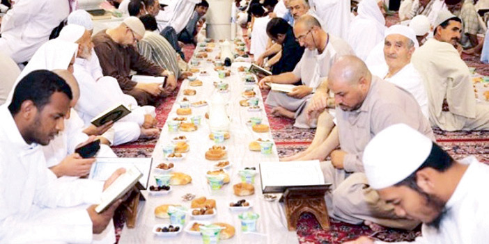 مع غروب شمس كل يوم من شهر رمضان المبارك تشهد ساحات وأروقة المسجد النبوي الشريف حركة مكثفة حيث تبدأ عملية مد موائد الإفطار داخل المسجد النبوي الشريف وخارجه ويحرص أهل الخير ممن دأبوا على تقديم هذه الموائد منذ عقود على أن تكون موائدهم في نفس الموقع داخل الحرم وهذه الموائد تقدم التمور ونوع من الخبز المخصص يسمى (الشريك) والقهوة وهذا العام ووفق تنظيم جديد هذا العام من وكالة الرئاسة العامة لشؤون المسجد النبوي سمح بدخول اللبن الزبادي وإلزام أصحاب هذه الموائد بإصدار ترخيص باسم أصحاب الموائد فقط فيما تشتمل الموائد التي يتم وضعها في الساحات المحيطة بالمسجد النبوي على ما لذ وطاب من الأطعمة والأشربة وتستقبل هذه الموائد رواد المسجد النبوي الشريف الذين يفطرون بالمسجد ولتنظيم هذه العملية يبذل منسوبو إدارة شؤون المسجد النبوي الشريف جهودًا موفقة ومكثفة ويسمح موظفو شؤون المسجد النبوي الشريف بدخول مواد هذه الموائد عقب صلاة العصر بعد التأكد من نوعية هذه المواد حيث لا يسمح إلا بالتمر واللبن الزبادي وبعض الخبز للموائد داخل المسجد النبوي الشريف بينما تتاح الفرصة للموائد خارج المسجد وفي الساحات الخارجية بوضع أطعمة أخرى منها المعجنات والعصائر وغيرها وتجد العمالة في هذه الموائد وكذلك الأعداد الكبيرة من المعتمرين ضالتها في هذه الموائد حيث يقوم المشرفون عليها بجذب المصلين قبل صلاة المغرب للجلوس على موائدهم كسبًا للأجر والثواب.