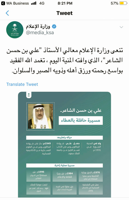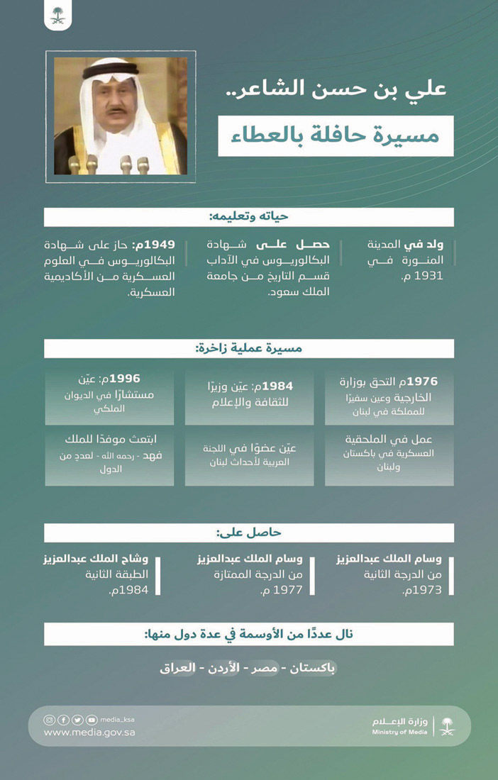 وعمل الشاعر وزيراً للإعلام في عهد خادم الحرمين الشريفين الملك فهد بن عبد العزيز - رحمه الله - كما عمل في العديد من المواقع الدبلوماسية والسياسية، وكان آخرها مستشاراً بالديوان الملكي في عام 1996م. وولد الفقيد علي الشاعر في المدينة المنورة عام 1931م، وعمل ملحقاً عسكرياً في بيروت ثم سفيراً في لبنان من عام 1976م حتى نهاية عام 1982م . بعدها تم تعيينه وزيراً للإعلام لمدة 14 عاماً، وفي عهده تم إطلاق بث القناة الثانية، ثم تم تعيينه مستشاراً بالديوان الملكي.
