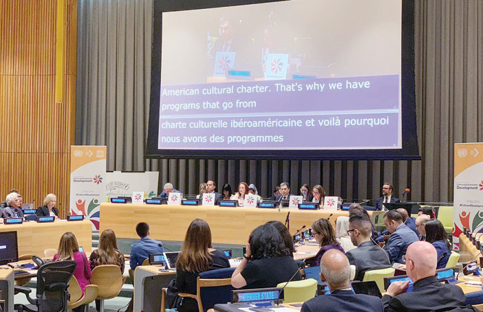أكدت المملكة العربية السعودية أنها كانت وما زالت وستظل تؤمن بقوة الثقافة والتراث الثقافي في جمع الناس والمجتمعات لتحقيق التنمية المستدامة وبأهمية الحفاظ على التراث الثقافي والطبيعي لتحقيق السلام والسعي المشترك مع كافة الدول لبناء مستقبل ثقافي غني تزدهر فيه مختلف أنواع الثقافة والفنون. جاء ذلك في كلمة المملكة يوم أمس الأول في الحدث رفيع المستوى «الثقافة والتنمية المستدامة» الذي تستضيفه الأمم المتحدة بمناسبة اليوم العالمي للتنوع الثقافي من أجل الحوار والتنمية، والتي ألقتها المشرف العام على العلاقات الدولية في وزارة الثقافة الدكتورة أفنان الشعيبي، وذلك بمقر الأمم المتحدة في نيويورك. وأفادت الشعيبي أن الثقافة تعد جزءاً أساسياً من رؤية 2030 التي تسير عليها المملكة بقيادة خادم الحرمين الشريفين الملك سلمان بن عبدالعزيز آل سعود وولي عهده الأمين صاحب السمو الملكي الأمير محمد بن سلمان بن عبدالعزيز -حفظهما الله-، مشيرةً إلى أن رؤية المملكة 2030 تنص على أن الثقافة من مقومات جودة الحياة. وقالت: نؤمن أن لدينا تراثًا غنيًّا وتقاليد عريقة ومتنوعة تنتمي لـ 13 منطقة، ولدينا مبدعون من مجالات متنوعة فاز العديد منهم بجوائز عالمية، وتمت استضافة أعمالهم في محافل دولية مختلفة، وإثباتاً لإيماننا بالثقافة والتراث وبأهداف التنمية المستدامة، ترجمنا إيماننا بالعمل الواقع، حيث أعلنت بلادي في يونيو 2018م، تأسيس وزارة الثقافة وأوكلت مهمة قيادتها لقائد مثقف من الشباب وهو سمو الأمير بدر بن عبدالله بن فرحان آل سعود. وأوضحت الدكتورة أفنان الشعيبي أنه في مارس الماضي 2019م، أطلقت وزارة الثقافة رؤية وتوجهات الثقافة التي ترتكز على أربعة مبادئ أساسية هي القيادة والدعم والرعاية والتطوير لـ 16 قطاعًا ثقافيًّا من ضمنها اللغة والموسيقى والمتاحف والمكتبات والتراث الطبيعي والشعر وفنون الطهي والأزياء والمواقع الثقافية والتراثية والكتب والنشر، إلى جانب إطلاق 27 مبادرة ثقافية تعد هي فقط البداية وأبرزها مجمع الملك سلمان للغة العربية وبرنامج ثقافة الطفل وبرنامج ترجم ونشر الفن بالأماكن العامة وأسابيع للأزياء وأكاديميات للفنون وتوثيق التراث الشفهي وغير المادي وغيرها. وأضافت قائلة: إن بلادي، لرؤيتها وتوجهاتها الثقافية ثلاثة أهداف رئيسية وهي أن تكون الثقافة نمط حياة عامرة وصحية للجميع، وأن تكون داعمًا للنمو الاقتصادي وإجاد فرص العمل والفرص الاستثمارية، بالإضافة للمساهمة مع شركائنا من دول العالم المختلفة في التنمية الدولية المستدامة، ونريد أن يرى العالم ثقافتنا المعتدة بتاريخنا وإرثنا وتقاليدنا العريقة وسنشرع أبواب المملكة للثقافات الأخرى، في عملية تلاقي وتبادل ثقافي إنساني. وأردفت تقول: نؤكد في بلادي على رسالة سمو وزير الثقافة الذي قال «بأننا صممنا رؤيتنا وتوجهاتنا لإزالة المعوقات، والحد من البيروقراطية، وتمكين المبدعين من ممارسة إبداعهم، وسنعمل على جعل الثقافة عاملاً لتكريس مفاهيم التعايش والحوار والسلام من أجل الأفضل، وسنمضي بخطى واثقة نحو مستقبل أكثر ازدهاراً ونماءً تتماشى بدقة مع المحاور الاستراتيجية لرؤية المملكة 2030، والمتمثلة في بناء مجتمع حيوي واقتصاد مزدهر ووطن طموح بإذن الله».