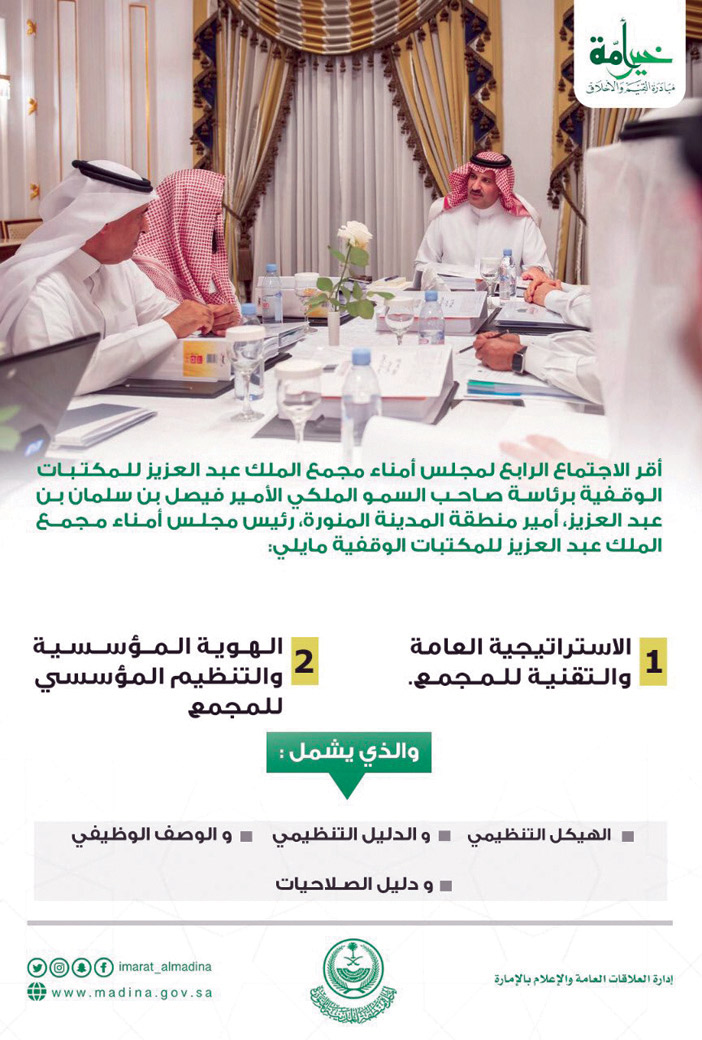 ترأس صاحب السمو الملكي الأمير فيصل بن سلمان بن عبدالعزيز، أمير منطقة المدينة المنورة، رئيس مجلس أمناء مجمع الملك عبدالعزيز للمكتبات الوقفية، الاجتماع الرابع لمجلس أمناء مجمع الملك عبدالعزيز للمكتبات الوقفية.