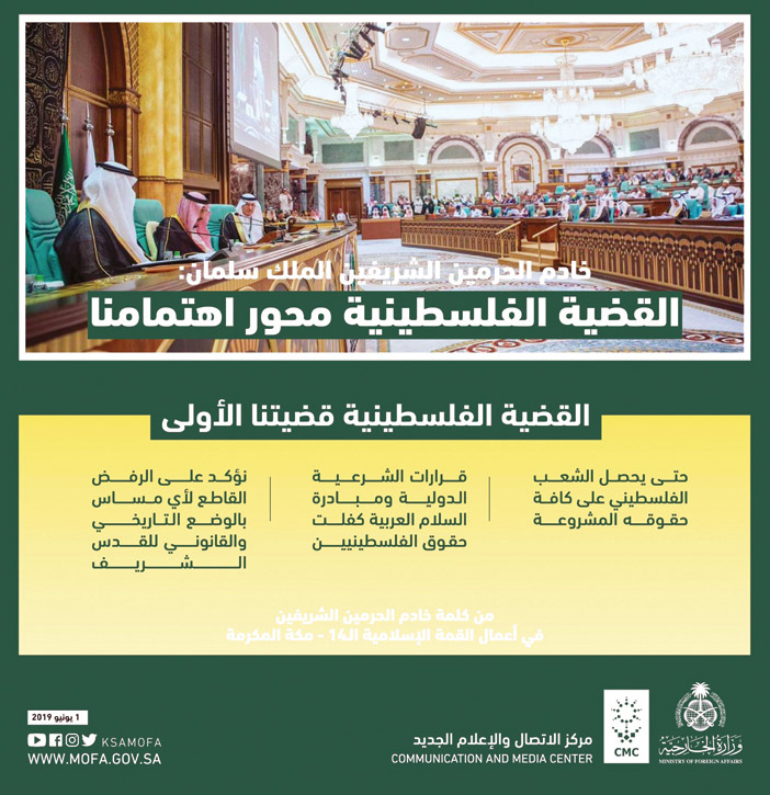 وقد صدر قرار بشأن قضية فلسطين والقدس الشريف عن الدورة الرابعة عشرة لمؤتمر القمة الإسلامي (قمة مكة : يداً بيد نحو المستقبل) التي عقدت مساء أمس في قصر الصفا بمكة المكرمة برئاسة خادم الحرمين الشريفين الملك سلمان بن عبد العزيز آل سعود - حفظه الله -، أكد أن السلام والأمن في منطقة الشرق الأوسط، كخيار استراتيجي لن يتحققا ألا بانسحاب إسرائيل، السلطة القائمة بالاحتلال، الكامل من أرض دولة فلسطين المحتلة منذ العام 1967، وفي مقدمتها القدس الشريف، وفق القانون الدولي وما نصت عليه القرارات الدولية ذات الصلة، ومبادرة السلام العربية بعناصرها كافة، وتسلسلها الطبيعي كما وردت في قمة بيروت في العام 2002، والتي نصت أن السلام مع إسرائيل يجب أن يسبقه إنهاء احتلالها للأراضي الفلسطينية والعربية المحتلة منذ عام 1967 ، بما فيها القدس الشرقية، واعترافها بدولة فلسطين وحقوق الشعب الفلسطيني غير القابلة للتصرف، بما فيها حق تقرير المصير وحق العودة للاجئين الفلسطينيين، وفق القرار 194 (1948) .