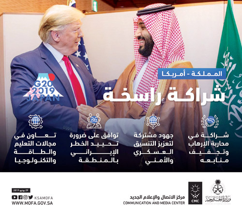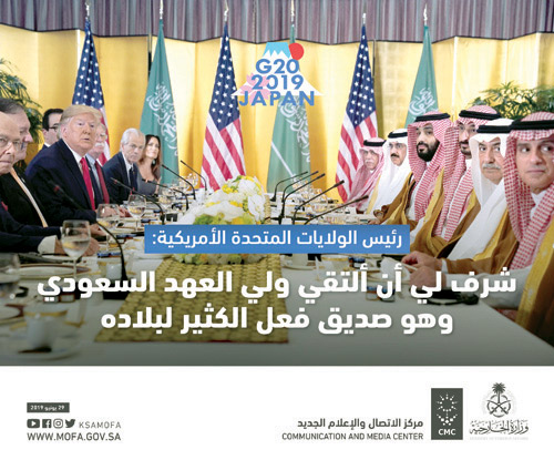 التقى صاحب السمو الملكي الأمير محمد بن سلمان بن عبدالعزيز ولي العهد نائب رئيس مجلس الوزراء وزير الدفاع رئيس وفد المملكة المشارك في قمة قادة دول مجموعة العشرين أمس فخامة الرئيس دونالد ترمب رئيس الولايات المتحدة الأمريكية، وذلك في مدينة أوساكا اليابانية.