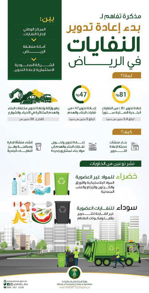 وتتمثَّل المبادرة الأولى ضمن الاتفاقية الإطارية، في إعادة تدوير نفايات البناء والهدم وتحويلها إلى مواد بناء لمشاريع الطرق والإسكان، تليها إنشاء منشأة لإدارة ومعالجة وفرز النفايات البلدية، وذلك بالتزامن مع مشروع أمانة منطقة الرياض «حي بلا حاويات»، والذي يهدف إلى الفرز الثنائي من المصدر للنفايات المنزلية في الرياض.