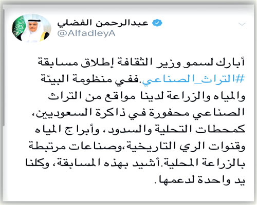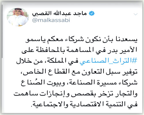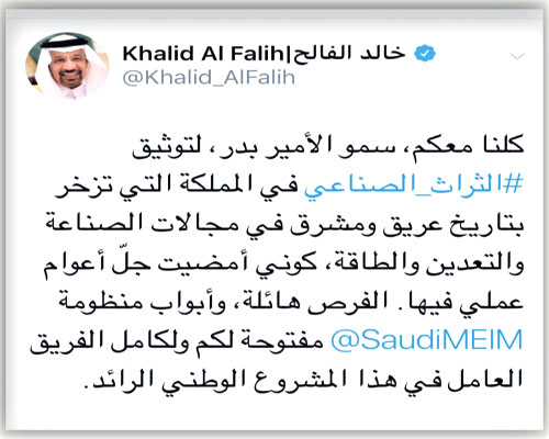 وقال وزير الطاقة والصناعة والثروة المعدنية خالد الفالح في تغريدة له بعد الإعلان «كلنا معكم، سمو الأمير بدر، لتوثيق التراث الصناعي في المملكة التي تزخر بتاريخ عريق ومشرق في مجالات الصناعة والتعدين والطاقة، كوني أمضيت جلّ أعوام عملي فيها. الفرص هائلة، وأبواب منظومة الوزارة مفتوحة لكم ولكامل الفريق العامل في هذا المشروع الوطني الرائد.