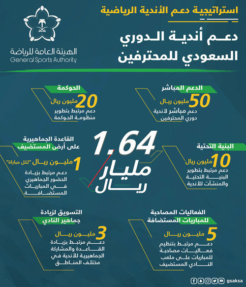 - مبلغ 50 مليون ريال سعوديّ لكل نادٍ من أندية دوري المحترفين والبالغ عددها (16 نادياً).