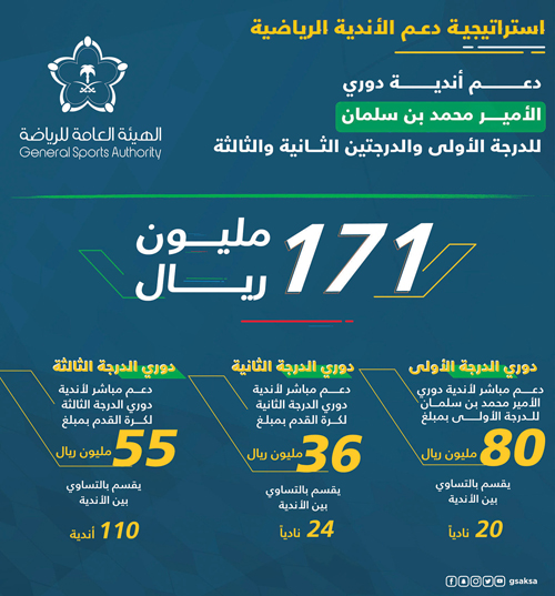 - مبلغ 55 مليون ريال سعودي يقسم بالتساوي بين أندية الدرجة الثالثة والبالغ عددها (110 أندية).