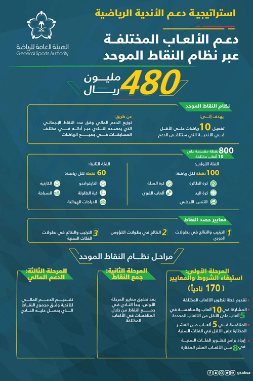 وفيما يخص الألعاب المختلفة وآلية دعمها فقد تم رصد مبلغ (480 مليون ريال سعودي) يتم منحه للنوادي الـ170 في المملكة لتحفيز جهودها في تنشيط مختلف الألعاب، وذلك بالارتكاز على مشاركتها والنتائج التي تحققها ضمن نظام «نقاط موحّد» تم تصميمه خصيصاً لهذا الهدف.
