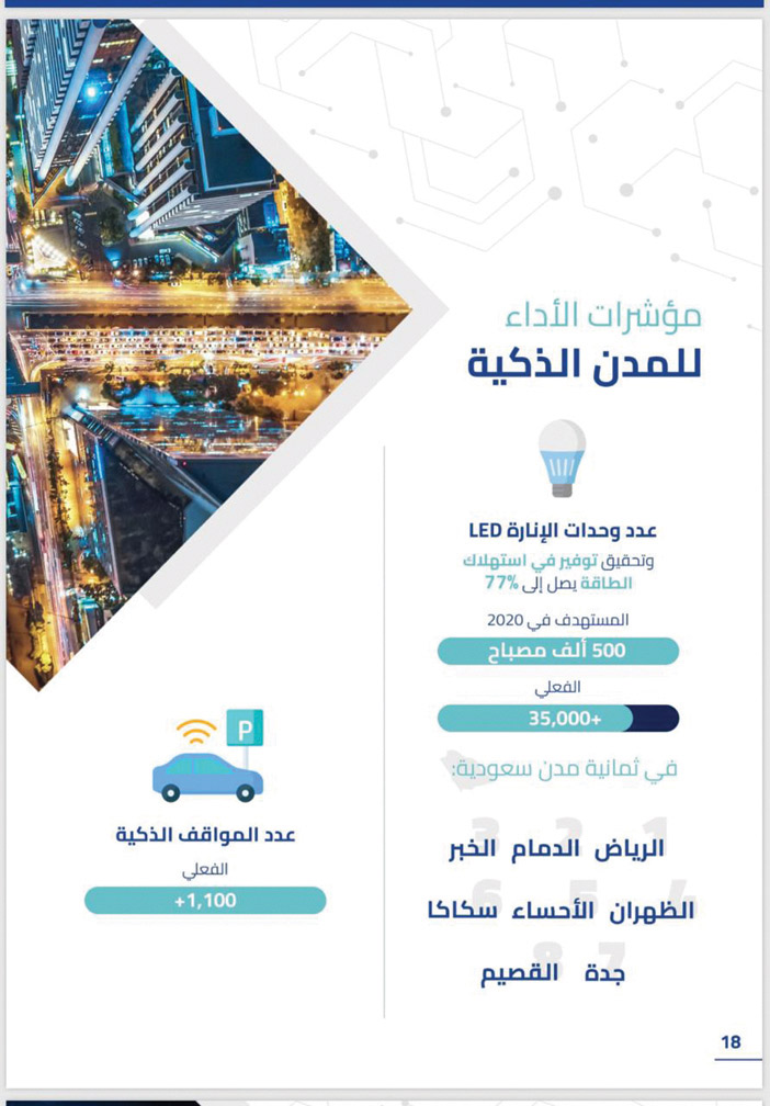 أما في قطاع الصحة فقد وصل عدد المواطنين المسجلين في خدمة موعد لعام 2019 إلى 5.5 مليون مواطن ووصل عدد المواعيد المسجلة في الخدمة إلى 9 مليون موعد. وفي قطاع التجارة الإلكترونية, فقد جرى إصدار نظام التجارة الإلكترونية الذي يهدف إلى تعزيز الثقة في المعاملات التجارية الإلكترونية وحماية حقوق المستهلك وتحفيز أنشطة التجارة الإلكترونية وتطويرها. وذلك سعياً لجعل مدننا ذكية ومتطورة فقد بلغ عدد وحدات الإنارة الذكية حتى الآن 35 ألف وحدة في ثماني مدن سعودية.