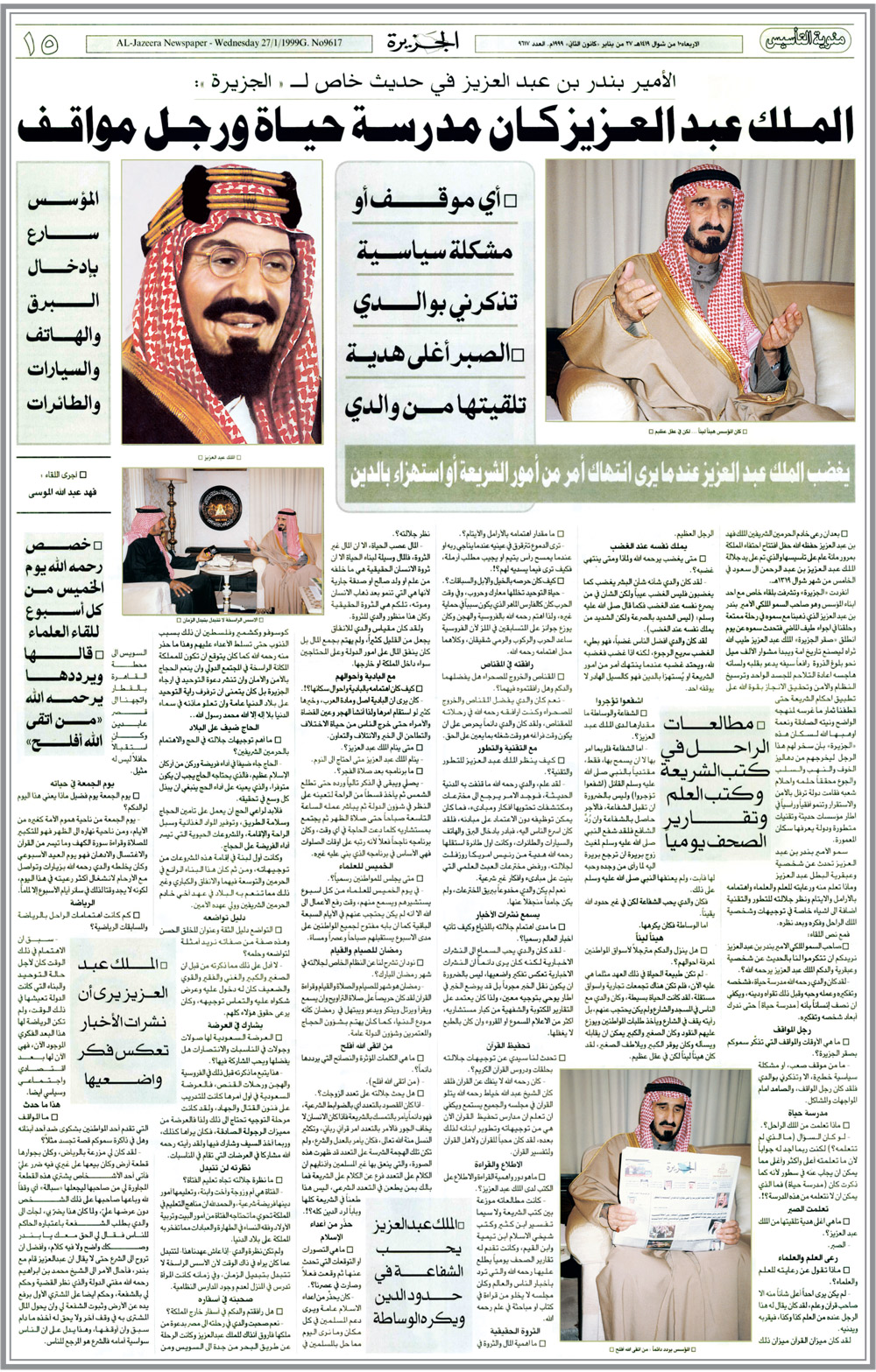 تعيد «الجزيرة» لقرائها اليوم، نشر حديث خاص أجرته الصحيفة مع الراحل صاحب السمو الملكي بندر بن عبدالعزيز آل سعود - رحمه الله، بمناسبة احتفاء المملكة بمرور 100 عام على تأسيسها في عام 1419 هـ.