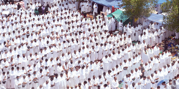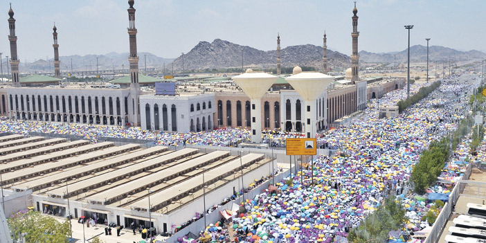 توافدت جموع غفيرة من حجاج بيت الله الحرام منذ وقت مبكر إلى مسجد نمرة في مشعر عرفات أمس لأداء صلاتَيْ الظُّهر والعصر جمعًا وقصرًا اقتداء بسُنة النبي المصطفى محمد - صلى الله عليه وسلم - والاستماع لخطبة عرفة.