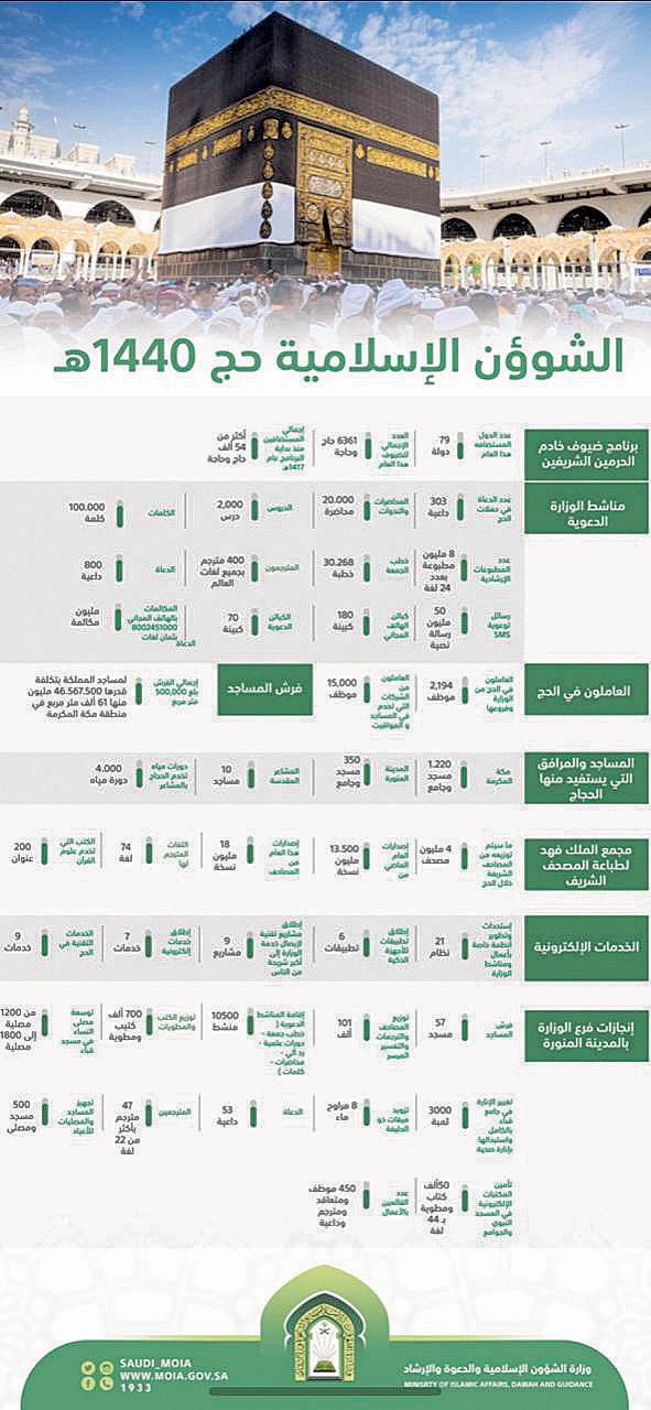 جسدت الجهود المتميزة التي قدمتها وزارة الشؤون الإسلامية خلال موسم حج هذا العام نموذجاً لمنظومة العمل الحكومي المتكامل المنطلق من توجيهات القيادة بتقديم أفضل الخدمات لضيوف الرحمن. وقدمت الوزارة بمتابعة حثيثة من معالي وزير الشؤون الإسلامية والدعوة والإرشاد الدكتور/ عبداللطيف آل الشيخ، خططاً فاعلة خلال هذا الموسم بدأت منذ وقت مبكر، وشملت تجهيز الجوامع والمساجد في المشاعر المقدسة والإشراف على مراكز التوعوية الإسلامية للحجيج بالعديد من اللغات وتنظيم عمل آلية الدعاة والخطباء.