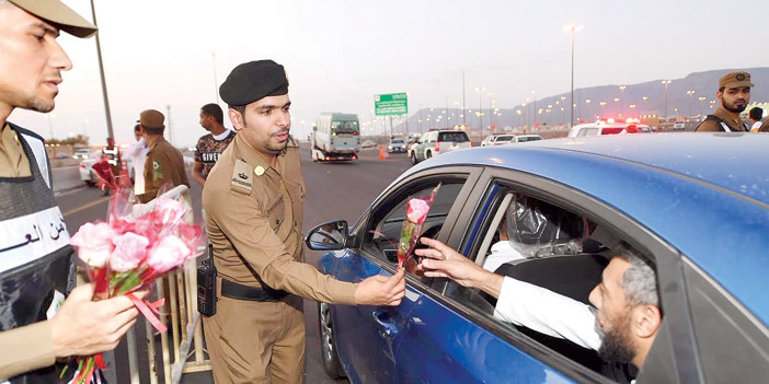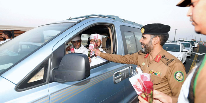 قامت إدارة مرور منطقة المدينة المنورة أمس بتوزيع الورود والهدايا على طلائع الحجاج القادمين إلى المدينة المنورة عبر طريق الهجرة.