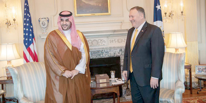 التقى صاحب السمو الملكي الأمير خالد بن سلمان بن عبدالعزيز نائب وزير الدفاع، بوزارة الخارجية الأمريكية في واشنطن أمس، معالي وزير خارجية الولايات المتحدة الأمريكية مايك بومبيو. وفور وصول سموه إلى مقر الوزارة قام بكتابة كلمة في سجل الزيارات. بعد ذلك جرى خلال اللقاء، استعراض العلاقات التاريخية بين البلدين الصديقين، وأوجه التعاون الثنائي في مختلف المجالات، وبحث التطورات والأحداث في المنطقة، بالإضافة إلى التأكيد على وقوف البلدين جنباً إلى جنب في التصدي للنشاطات الإيرانية العدائية وفي محاربة التطرف والإرهاب وأهمية حماية حرية الملاحة في المياه الدولية ودور قوات تحالف دعم الشرعية في اليمن لاستعادة الأمن والاستقرار لها. حضر اللقاء صاحبة السمو الملكي الأميرة ريما بنت بندر بن سلطان بن عبدالعزيز سفيرة خادم الحرمين الشريفين لدى الولايات المتحدة الأمريكية. كما حضره من الجانب الأمريكي، وكيل وزارة الخارجية للشؤون السياسية ديفيد هيل، ومساعد وزير الخارجية لشؤون الشرق الأدنى ديفيد شينكر.