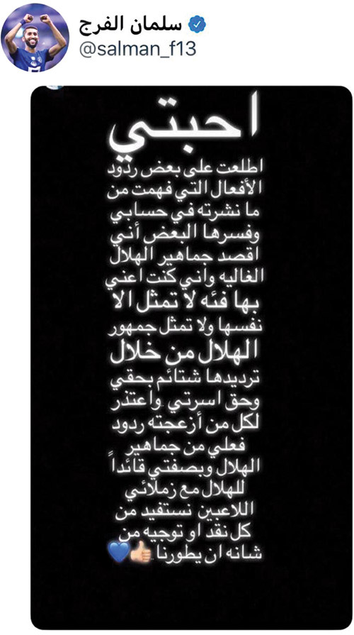 قدم لاعب الهلال سلمان الفرج اعتذاره لجماهير ناديه على ما فهم من تغريدة له فسرها البعض أنها إساءة موجهة للجماهير الهلالية بينما هي موجهة لقلة قليلة ممن أساؤا له ولأسرته حسب قوله لا يمثلون إلا أنفسهم!! وقال الفرج إنني اعتذر لجماهير الهلال الذين أزعجتهم تلك التغريدة. مؤكداً أنه بصفته قائداً للفريق يستفيد هو وزملاؤه من كل نقد أو توجيه إيجابي يساهم في تلافي بعض الأخطاء ويطور من الأداء. وقابلت جماهير الهلال هذا الاعتذار من الفرج بتقدير كبير، حيث أثنت عليه عبر وسائل التواصل الاجتماعي وطالبته وزملائه بتلافي أخطاء المباريات الماضية ومضاعفة الجهد والعطاء لتحقيق آمالهم بالفوز بأكثر من لقب هذا الموسم.