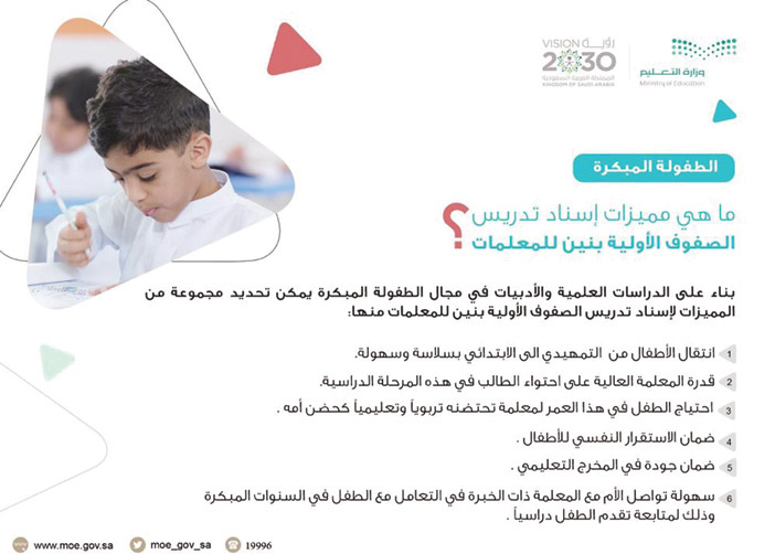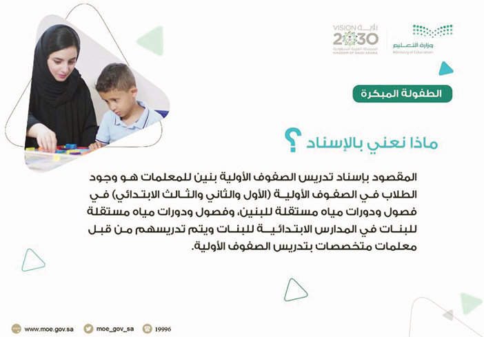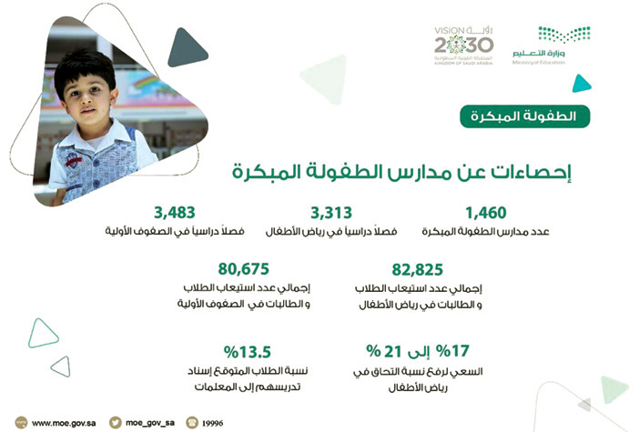 وأوضح معالي الدكتور حمد آل الشيخ أن وزارة التعليم تبدأ في هذا العام بتنفيذ مدارس الطفولة المبكرة، التي تُعد واحدة من أهم التحولات الاستراتيجية في النظام التعليمي، وتهدف إلى تجويد التعليم، وحصول كل طفل على فرص التعليم وفق خيارات متنوعة، تشمل التوسع في رياض الأطفال لتصل نسبة الزيادة في الإلحاق عن العام الماضي أكثر من 50 في المئة، فيما ستحقق نمواً شاملاً في توفير المقاعد بنسبة 21 في المئة بعد أن كانت 17 في المئة، وكذلك سيكون إسناد تدريس الصفوف الأولية «بنين» لمعلمات متخصصات، بعد إعادة تأهيل المدارس الحكومية القائمة وتطويرها لتصبح الفصول والخدمات الخاصة بالبنين مستقلة عن البنات، مبينًا أن الوزارة وإدارات التعليم في المناطق التعليمية بذلت خلال خمسة أشهر مضت جهوداً كبيرة في تجهيز 1460 مدرسةً من مدارس هذا المشروع الطموح واستلامها في الموعد المحدد لانطلاق العمل فيها.