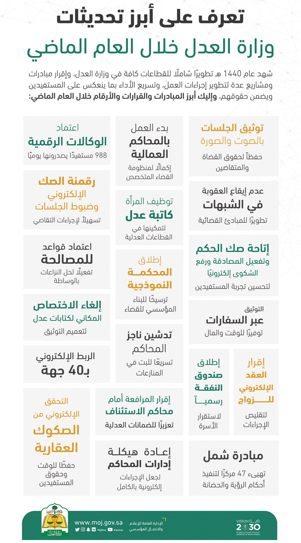 وأعلن معالي وزير العدل رئيس المجلس الأعلى للقضاء اكتمال منظومة القضاء المتخصص بإنشاء المحاكم العمالية ومباشرة اختصاصاتها المنصوص عليها في نظام المرافعات الشرعية بالنظر في القضايا العمالية. وشرعت كتابات العدل في أنحاء المملكة كافة، بخدمة المستفيدين وفقاً للمرحلة الرقمية التي انطلقت خلال العام المنصرم، مستغنية عن الورق وممكنةً المستفيدين من إصدار الوكالات منخفضة المخاطر عبر بوابة الوزارة www.moj.gov.sa ، دون الحاجة لزيارة كتابات العدل.