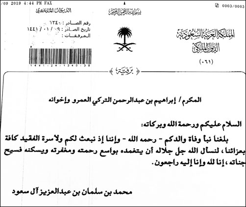 تلقى الزميل د. إبراهيم بن عبدالرحمن التركي مدير التحرير للشؤون الثقافية برقيتي عزاء من مقام خادم الحرمين الشريفين الملك سلمان بن عبدالعزيز وصاحب السمو الملكي الأمير محمد بن سلمان بن عبدالعزيز ولي العهد بعدما بلغهما نبأ وفاة والده عميد الأسرة الأستاذ عبدالرحمن العلي التركي العمرو وطلبا نقل تعازيهما للأسرة والدعاء إلى الله تعالى أن يتغمد الراحل بواسع رحمته ومغفرته ويسكنه فسيح جناته، وقد ثمّنت الأسرة هذه المبادرة النبيلة وتمنت لهما طول العمر وسداد العمل وألا بريهما مكروهًا. واستقبل المهندس علي بن عبدالرحمن التركي مدير كهرباء القصيم سابقًا اتصالاً هاتفيًا من صاحب السمو الملكي الأمير فيصل بن مشعل بن سعود بن عبدالعزيز أمير منطقة القصيم الذي قدم تعازيه لوالدتهم وأشقائه وشقيقاته. كما تلقت الأسرة برقيات عزاء واتصالات من معالي الدكتور إبراهيم العساف وزير الخارجية وسفير دولة الكويت علي الخالد الجابر الصباح ومعالي الدكتور يوسف العثيمين أمين منظمة التعاون الإسلامي ومعالي الأستاذ إياد مدني وزير الإعلام الأسبق ومعالي الدكتور نزار مدني وزير الدولة السابق للشؤون الخارجية ومعالي الأستاذ مساعد السناني وزير العمل والشؤون الاجتماعية الأسبق ومعالي الفريق سليمان العمرو مدير عام الدفاع المدني واتصالات هاتفية وحضورًا مباشرًا من عدد كبير من أصحاب السمو والفضيلة والمعالي والوسط الثقافي وأصدقاء الراحل وتلاميذه ومحبيه، وامتلأ جامع البسام ومقبرة الرحمة ومنزلهم في عنيزة بجموع غفيرة من مشيعيه وعارفي فضله، وإذ تشكرهم جميعًا والمئات الذين كتبوا عبر الوسائط المتعددة معزين ومذكرين بمناقب الراحل الكريم لتتوجهُ إلى العلي القدير أن يسكن الفقيد عليين ويحفظ الجميع ويحفظ لهم.