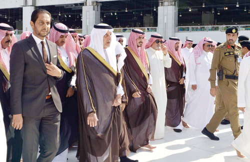 وكان في استقبال سموه لدى وصوله المسجد الحرام معالي الرئيس العام لشؤون المسجد الحرام والمسجد النبوي الشيخ الدكتور عبدالرحمن بن عبدالعزيز السديس, وفور وصول سموه قام ومرافقوه بغسل الكعبة المشرَّفة من الداخل بماء زمزم الممزوج بماء الورد.