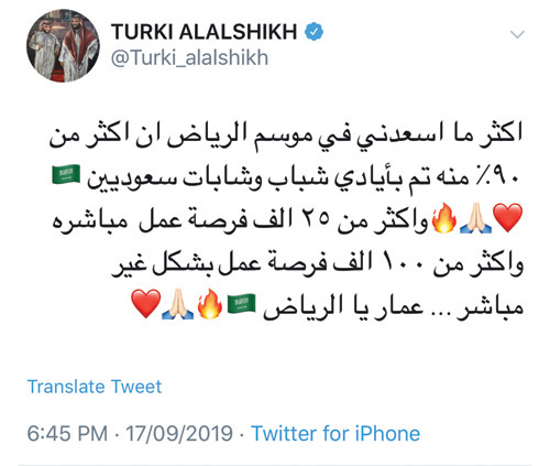 وأعرب آل الشيخ في تغريدة على حسابه في « تويتر « عن اعتزازه كون أن أكثر من 90 في المئة من فعاليات موسم الرياض تمت بأيادي شباب وشابات سعوديين.