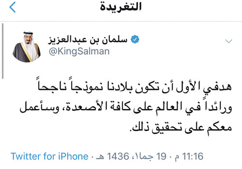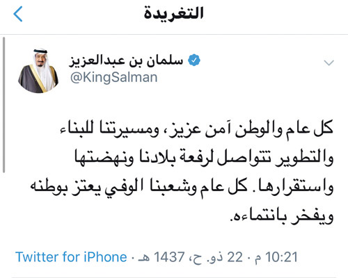 حتى تغريداته الأخرى - رعاه الله - عبر حسابه في التويتر بمناسبة الأيام الوطنية هي مُثُل تنهض على الأرض، وقيم ترتقي إلى السماء، ووفاء من أهل الوفاء لمن غرس الوفاء فسائلاً لا يذبل جريدها، ولا يذبل لونها.. أفعال مليكنا «سلمان» انتماء للحقيقة.