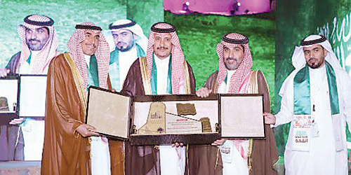 وبعد ختام الندوة افتتح سمو المحافظ المعرض المقام بهذه المناسبة والذي شارك فيه عدد من الجهات الحكومية والجمعيات، بعد ذلك شرف سموه والحضور الحفل المسرحي الذي أقامته إدارة التعليم والبلدية، والذي بدأ بالسلام الملكي ثم القرآن الكريم ثم كلمة مدير التعليم الدكتور صالح الربيعة، فكلمة أخرى لرئيس البلدية المهندس فهد الرميح، تلاه قصيده للشاعر أشرف العفيصان ثم قدم مجموعة من الأطفال لوحة ترحيبية، بعد ذلك دشن سموه عددًا من المشاريع تعليمية وتربوية ومشاريع بلدية خدمية، تلا ذلك أوبريت وطني (همة حتى القمة) من كلمات الأستاذ سعد الثنيان وأداء طلاب مدارس المحافظة وإخراج المبدع دائمًا الأستاذ عبد الله السناني. بعده ألقى سمو محافظ المجمعة كلمة أكد فيها أن محافظة المجمعة تحظى كما يحظى أي شبر في الوطن بمظاهر عديدة من مظاهر الإنجازات والمكتسبات في الأرض والإنسان بما يعطي نماذج لما وصلت إليه هذه البلاد من تطور ونماء تحت راية التوحيد وبقيادات حكيمة تواترت على هذه البلاد، وأضاف أننا ننعم هذا الزمن بتولي مولاي خادم الحرمين الشريفين الملك سلمان بن عبد العزيز دفتها وسط بحر متلاطم يموج بالعالم سياسيًا واقتصاديًا، يقودها بخبرة السنين ومهارة القائد المحنك، يسانده طموح الشباب ممثلاً في سمو ولي عهده الأمين مهندس الرؤية التي رسمت طريقًا واضحًا للمحافظة على المكتسبات واستغلال الإمكانات ومحاربة الفساد والعشوائية والهدر بما يكفل مستقبل الأجيال، بعد ذلك رفع سموه باسمه ونيابة عن أهالي المحافظة التهاني لخادم الحرمين الشريفين ولسمو ولي العهد وإلى الشعب السعودي الكريم بمناسبة ذكرى اليوم الوطني. بعد ذلك تم تكريم شركاء النجاح ثم قدمت فرقة الفنون الشعبية بالمجمعة العرضة السعودية التي شارك سمو المحافظ وعدد من الحضور فيها.