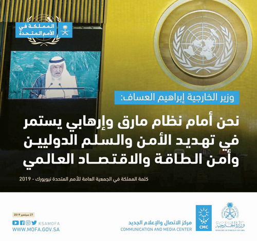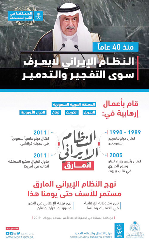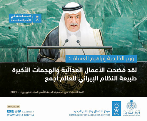 وقال الوزير العساف : نحن نعلم جيداً من وراء هذا الهجوم، ودعونا خبراء من الأمم المتحدة وخبراء دوليين للتثبت من ذلك بأنفسهم. إن من يقف وراء هذا الهجوم هو من هاجم الناقلات التجارية في خليج عمان في شهري يونيو ويوليو الماضيين، وتبعه عملاؤه بالهجوم على مطار أبها في شهر يوليو وحقل شيبة النفطي في شهر أغسطس، هو النظام الذي يستتر بشكل رخيص وجبان عبر تحميل الميليشيات التابعة له مسؤولية الهجمات على بقيق وخريص وقبل ذلك على محطات ضخ النفط، النظام الذي لا ينظر لدولنا وشعوبنا سوى أنها ساحات لتحقيق أجندته التدميرية. وأضاف معالي وزير الخارجية قائلاً : إننا نعرف هذا النظام جيداً منذ أربعين عاماً، فهو لا يعرف سوى التفجير والتدمير، والاغتيال ليس في منطقتنا فحسب، بل في العالم أجمع، هذا النظام هو الذي قام منذ نشأته بأعمال إرهابية في المملكة العربية السعودية والبحرين والكويت ولبنان والدول الأوروبية وفي مختلف أرجاء المعمورة. هو النظام الذي اغتال عدداً من الدبلوماسيين السعوديين في تايلند عامي 1989 و1990، واغتال في عام 2011م دبلوماسياً سعودياً في مدينة كراتشي - رحمهم الله - وفي نفس العام حاول اغتيال سفير المملكة آنذاك في الولايات المتحدة الأمريكية. هو النظام الذي اغتال رئيس وزراء لبنان رفيق الحريري في قلب بيروت عام 2005م، وهذا النهج مستمر للأسف حتى يومنا هذا، فقد رأينا في الأعوام الأخيرة محاولات هذا النظام الإرهابية في الدنمارك وفرنسا، ونرى كل يوم نهجه الإرهابي في اليمن وسوريا والعراق ولبنان وسائر دول المنطقة.