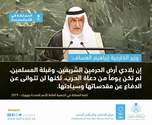 ولفت وزير الخارجية الانتباه في ختام كلمته بقوله : إن بلادي، أرض الحرمين الشريفين، وقبلة المسلمين، لم تكن يوماً من دعاة الحرب، لكنها لن تتوانى عن الدفاع عن مقدساتها وسيادتها.