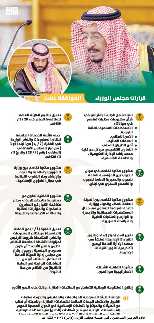 تاسعاً: بعد الاطلاع على محضر اللجنة المشكلة لدراسة موضوع الإشراف على الذبح (الحلال) للحوم المصدرة إلى المملكة، وبعد الاطلاع على التوصية المعدة في مجلس الشؤون الاقتصادية والتنمية رقم (10ـ 9/ 40/ د) وتاريخ 19/ 2/ 1440هـ، قرر مجلس الوزراء الموافقة على إطلاق المنظومة الوطنية للتعامل مع المنتجات (الحلال)، وذلك على نحو تضمن الآتي: