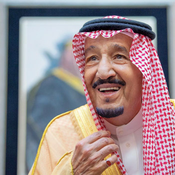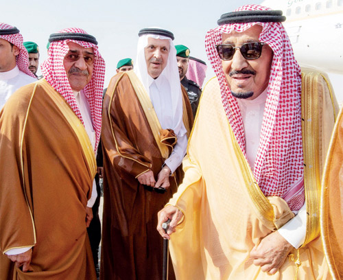 وكان في استقبال خادم الحرمين الشريفين -أيده الله- عند سلم الطائرة، صاحب السمو الملكي الأمير عبدالإله بن عبدالعزيز آل سعود المستشار الخاص لخادم الحرمين الشريفين، وصاحب السمو الملكي الأمير مقرن بن عبدالعزيز آل سعود، وصاحب السمو الملكي الأمير فيصل بن بندر بن عبدالعزيز أمير منطقة الرياض، وصاحب السمو الملكي الأمير سلطان بن سلمان بن عبدالعزيز رئيس مجلس إدارة الهيئة السعودية للفضاء.