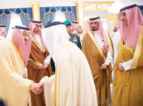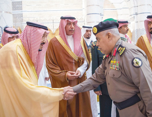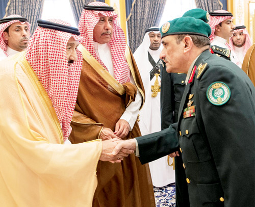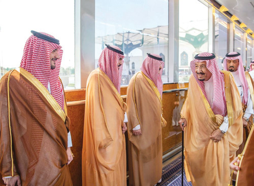 كما كان في استقبال خادم الحرمين الشريفين -حفظه الله- بصالة التشريفات كل من صاحب السمو الأمير خالد بن فهد بن خالد، وصاحب السمو الملكي الأمير تركي الفيصل بن عبدالعزيز، وصاحب السمو الملكي الأمير مشعل بن سعود بن عبدالعزيز، وصاحب السمو الأمير فهد بن عبدالله بن محمد، وصاحب السمو الملكي الأمير عبدالرحمن بن عبدالله الفيصل، وصاحب السمو الملكي الأمير سعود بن عبدالله الفيصل، وصاحب السمو الملكي الأمير سعود بن سعد بن عبدالعزيز، وصاحب السمو الملكي الأمير خالد بن سلطان بن عبدالعزيز، وصاحب السمو الملكي الأمير خالد بن سعد بن عبدالعزيز، وصاحب السمو الملكي الأمير نايف بن سعود بن عبدالعزيز، وصاحب السمو الأمير محمد بن عبدالعزيز بن محمد، وصاحب السمو الأمير الدكتور عبدالرحمن بن سعود الكبير، وصاحب السمو الأمير عبدالله بن فيصل بن تركي، وصاحب السمو الملكي الأمير محمد بن مشاري بن عبدالعزيز، وصاحب السمو الملكي الأمير متعب بن عبدالله بن عبدالعزيز، وصاحب السمو الملكي الأمير فيصل بن خالد بن عبدالعزيز مستشار خادم الحرمين الشريفين، وصاحب السمو الأمير سعود بن عبدالله بن ثنيان، وصاحب السمو الملكي الأمير محمد بن نواف بن عبدالعزيز مستشار خادم الحرمين الشريفين، وصاحب السمو الملكي الأمير سطام بن سعود بن عبدالعزيز، وصاحب السمو الملكي الأمير مشاري بن سعود بن عبدالعزيز، وصاحب السمو الأمير تركي بن فهد بن جلوي، وصاحب السمو الأمير الدكتور خالد بن عبدالله بن محمد، وصاحب السمو الملكي الأمير خالد بن تركي بن عبدالعزيز، وصاحب السمو الأمير الدكتور مشعل بن عبدالله بن مساعد، وصاحب السمو الأمير الدكتور تركي بن سعود بن محمد المستشار في الديوان الملكي، وصاحب السمو الملكي الأمير جلوي بن عبدالعزيز بن مساعد أمير منطقة نجران، وصاحب السمو الملكي الأمير عبدالعزيز بن بندر بن عبدالعزيز، وصاحب السمو الأمير أحمد بن عبدالله بن عبدالرحمن محافظ الدرعية، وصاحب السمو الأمير عبدالمحسن بن عبدالله بن عبدالرحمن، وصاحب السمو الملكي الأمير منصور بن ناصر بن عبدالعزيز سفير خادم الحرمين الشريفين لدى سويسرا، وصاحب السمو الملكي الأمير فيصل بن تركي بن عبدالعزيز المستشار في الديوان الملكي، وصاحب السمو الأمير خالد بن ثنيان بن محمد، وصاحب السمو الأمير الدكتور نايف بن ثنيان بن محمد، وصاحب السمو الأمير عبدالرحمن بن عبدالله بن فيصل محافظ المجمعة، وصاب السمو الملكي الأمير عبدالرحمن بن مساعد بن عبدالعزيز، وعدد من أصحاب السمو الوزراء والمعالي الوزراء وكبار المسؤولين من مدنيين وعسكريين. وقد وصل في معية خادم الحرمين الشريفين، كل من صاحب السمو الملكي الأمير منصور بن سعود بن عبدالعزيز، وصاحب السمو الملكي الأمير طلال بن سعود بن عبدالعزيز، وصاحب السمو الأمير خالد بن سعد بن فهد، وصاحب السمو الملكي الأمير خالد بن بندر بن عبدالعزيز مستشار خادم الحرمين الشريفين، وصاحب السمو الأمير فيصل بن سعود بن محمد، وصاحب السمو الملكي الأمير الدكتور حسام بن سعود بن عبدالعزيز أمير منطقة الباحة، وصاحب السمو الملكي الأمير الدكتور عبدالعزيز بن سطام بن عبدالعزيز مستشار خادم الحرمين الشريفين، وصاحب السمو الملكي الأمير سعود بن سلمان بن عبدالعزيز، وصاحب السمو الملكي الأمير عبدالمجيد بن عبدالإله بن عبدالعزيز. كما وصل في معيته - رعاه الله - معالي رئيس الديوان الملكي الأستاذ فهد بن محمد العيسى، ومعالي رئيس المراسم الملكية الأستاذ خالد بن صالح العباد، ومعالي مساعد السكرتير الخاص لخادم الحرمين الشريفين الأستاذ تميم بن عبدالعزيز السالم، ومعالي رئيس الحرس الملكي الفريق أول ركن سهيل بن صقر المطيري، ومعالي رئيس الشؤون الخاصة لخادم الحرمين الشريفين المهندس ناصر بن عبدالرزاق النفيسي.