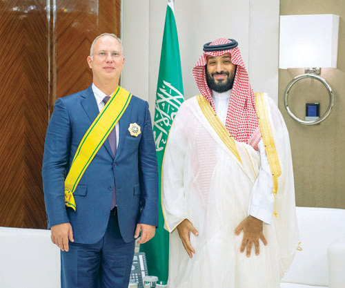 تنفيذاً لأمر خادم الحرمين الشريفين الملك سلمان بن عبد العزيز آل سعود -حفظه الله- قلد صاحب السمو الملكي الأمير محمد بن سلمان بن عبد العزيز ولي العهد نائب رئيس مجلس الوزراء وزير الدفاع أمس الرئيس التنفيذي لصندوق الاستثمار الروسي المباشر السيد كيريل ديمترييف وشاح الملك عبد العزيز من الطبقة الثانية، وذلك تقديراً لجهوده في تقوية أوجه التعاون بين المملكة العربية السعودية وروسيا الاتحادية. كما جرى خلال اللقاء استعراض العلاقات الثنائية بين البلدين الصديقين خاصة في المجالات الاستثمارية ومجالات التعاون الأخرى. حضر مراسم التقليد واللقاء صاحب السمو الملكي الأمير عبد العزيز بن سلمان بن عبد العزيز وزير الطاقة، وصاحب السمو الملكي الأمير عبد الله بن بندر بن عبد العزيز وزير الحرس الوطني ، ومعالي وزير الدولة عضو مجلس الوزراء الدكتور مساعد بن محمد العيبان.