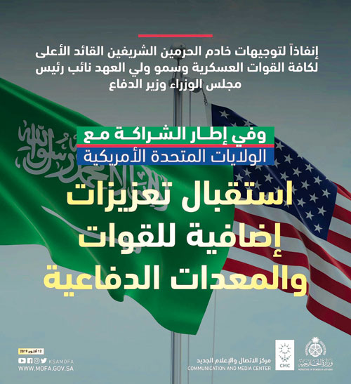 صرح مصدر مسؤول في وزارة الدفاع بأنه إنفاذاً لتوجيهات خادم الحرمين الشريفين القائد الأعلى لكافة القوات العسكرية وسمو ولي العهد نائب رئيس مجلس الوزراء وزير الدفاع -حفظهما الله-، وانطلاقاً من العلاقات التاريخية والشراكة الراسخة بين المملكة العربية السعودية والولايات المتحدة الأمريكية، تقرر استقبال تعزيزات إضافية للقوات والمعدات الدفاعية في إطار العمل المشترك بين المملكة والولايات المتحدة؛ لصون الأمن الإقليمي ومواجهة أي محاولات تهدد الاستقرار في المنطقة والاقتصاد العالمي.
