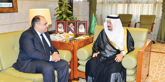 من جهة ثانية استقبل صاحب السمو الملكي الأمير فيصل بن بندر بن عبدالعزيز أمير منطقة الرياض في مكتبه بقصر الحكم أمس، سفير جمهورية قبرص المعين لدى المملكة ستافروس افجوستيدس. وجرى خلال الاستقبال تبادل الأحاديث الودية ومناقشة عدد من الموضوعات ذات الاهتمام المشترك بين البلدين الصديقين. كما استقبل سموه في مكتبه بقصر الحكم أمس مدير عام فرع وزارة الشؤون الإسلامية والدعوة والإرشاد المكلف بالمنطقة الشيخ سامي بن سليمان المشيقح. وقدم المشيقح عرضًا عن آخر أعمال الفرع وإنجازاته على مستوى المنطقة، كما استعرض إحصائيات ميدانية وعملية. وناقش سموه خلال الاستقبال سبل التطوير والتنسيق بين الفرع وإمارة المنطقة.