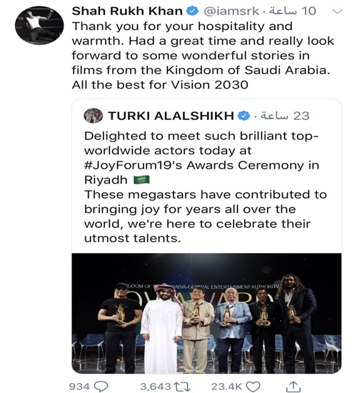 وكتب شاروخ خان، عبر حسابه على تويتر، قائلا: شكراً لك على حسن الضيافة وقضيت وقتا رائعا وأتطلع إلى بعض القصص الرائعة في الأفلام من المملكة العربية السعودية كل التوفيق لبرنامج Vision 2030.