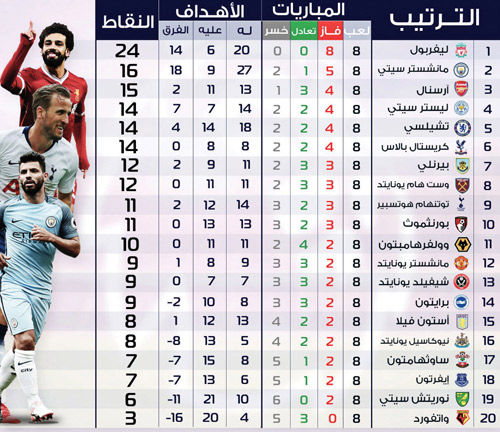 وتفصل 15 نقطة بين ليفربول المتصدر بالعلامة الكاملة (24) ومانشستر يونايتد الثاني عشر بعد مرور ثماني مراحل فقط من الدوري المحلي هذا الموسم.