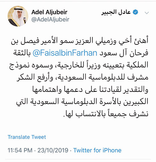 من جانب ذي صلة هنأ وزير الدولة للشؤون الخارجية وعضو مجلس الوزراء عادل الجبير الأمير فيصل بن فرحان ، وقال في تغريدة على حسابه في « تويتر « أهنئ أخي وزميلي العزيز الأمير فيصل بن فرحان آل سعود بالثقة الملكية بتعيينه وزيرا للخارجية ، وسموه نموذج مشرف للدبلوماسية السعودية ، وأرفع الشكر والتقدير لقيادتنا على دعمها واهتمامها الكبيرين بالأسرة الدبلوماسية السعودية التي نشرف جميعا بالانتساب لها.