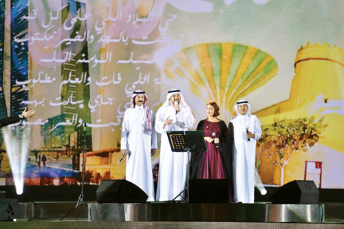 وكانت المفاجأة في ختام ليلة عبدالرحمن بن مساعد ترديد الفنانين المشاركين بمقطع وطني من ملحمة «كتاب مجد بلادنا» الذي افتتحت به الجنادرية 13.