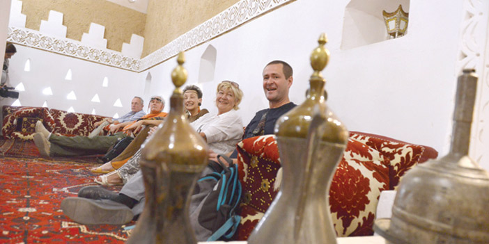 وفي أروقة القصر الذي بُني قبل أكثر من 150 سنة سار إلى جانبهم مرشد سياحي، ارتدى اللباس التقليدي (الأبيض والغترة الحمراء) محاولاً شرح تقاليد الضيافة العربية.