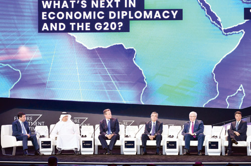 أكد معالي وزير الدولة وعضو مجلس الوزراء الدكتور إبراهيم بن عبدالعزيز العساف أن المملكة لا تزال تعد لقمة قادة مجموعة العشرين التي سترأسها في 2020. وقال الدكتور العساف خلال مشاركته في الجلسة بعنوان: «ما هو مستقبل الدبلوماسية الاقتصادية ومجموعة العشرين»: كل من رئيس وزراء بريطانيا الأسبق ديفيد كاميرون، ورئيس وزراء فرنسا الأسبق فرانسوا فيلون، ورئيس وزراء إيطاليا الأسبق ماتيو رينزي، ورئيس وزراء أستراليا الأسبق كيفن رود، في ختام جلسات فعاليات الدورة الثالثة لمبادرة مستقبل الاستثمار 2019م، المنعقدة في مركز الملك عبدالعزيز للمؤتمرات في الرياض من الفترة 29 – 31 أكتوبر 2019، قال: إنه جرى عقد العديد من الاجتماعات على مستوى عالٍ برئاسة صاحب السمو الملكي الأمير محمد بن سلمان بن عبدالعزيز ولي العهد نائب رئيس مجلس الوزراء وزير الدفاع رئيس مجلس الشئون الاقتصادية والتنمية، رئيس مجلس صندوق الاستثمارات العامة.