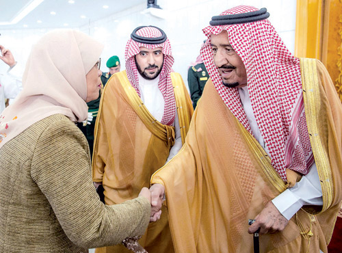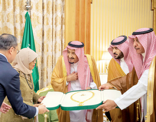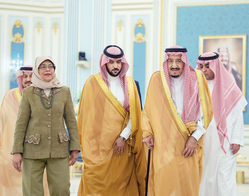 عقد خادم الحرمين الشريفين الملك سلمان بن عبدالعزيز آل سعود -حفظه الله- أمس، جلسة مباحثات رسمية مع فخامة الرئيسة حليمة يعقوب رئيسة جمهورية سنغافورة. وقبيل المباحثات، سلَّم خادم الحرمين الشريفين -أيده الله- فخامة رئيسة جمهورية سنغافورة قلادة الملك عبدالعزيز، تقديراً لفخامتها. عقب ذلك، تم بحث العلاقات بين المملكة وسنغافورة، وفرص تعزيز التعاون بين البلدين في المجالات كافة، إضافة إلى بحث عدد من الموضوعات ذات الاهتمام المشترك.
