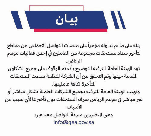وأوضح آل الشيخ أنه ثبت تسديد الشركة المنظمة للمستحقات المالية المتأخرة لجميع عامليها، داعيًا المتضررين للتواصل معها عبر الايميل: