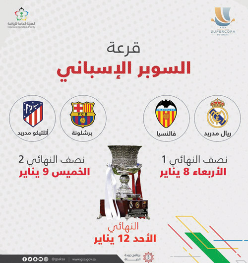 وجرت مراسم القرعة أمس في حفل كبير احتضنته العاصمة الإسبانية مدريد، بحضور الأمير عبدالعزيز بن تركي الفيصل رئيس مجلس إدارة الهيئة العامة للرياضة، والأمير منصور بن خالد الفرحان سفير خادم الحرمين الشريفين في إسبانيا، وياسر المسحل رئيس الاتحاد السعودي لكرة القدم، والسيد «لويس روبياليس» رئيس الاتحاد الإسباني لكرة القدم، ومدير العلاقات المؤسسية في نادي ريال مدريد السيد «إيميليو بوتراغينيو»، إضافة إلى مدير العلاقات المؤسسية في نادي برشلونة «غييرمو أمور» ورئيس نادي أتلتيكو مدريد «إنريكي سيريزو» ورئيس نادي فالنسيا «أنيل مورثي»، إضافة إلى ممثلي الاتحادات المحلية والإعلام الإسباني وعدد من نجوم الكرة الإسبانيّة، يأتي في مقدمتهم لاعب ريال مدريد وقائد المنتخب الإسباني «سيرجيو راموس»، ونجم برشلونة «بوسكيتس»، ولاعب أتلتيكو مدريد «ساؤول»، وأخيرًا لاعب نادي فالنسيا «غايا».