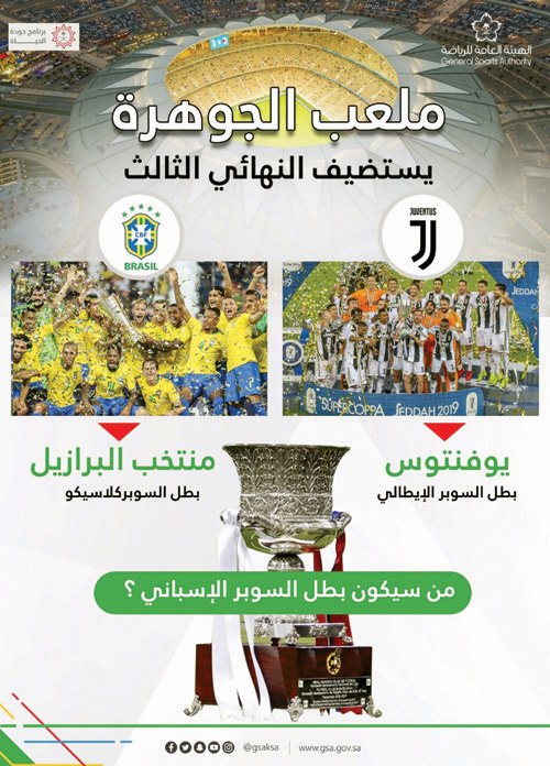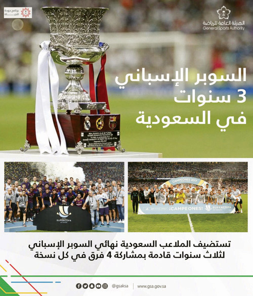 أعلنت الهيئة العامة للرياضة استضافة المملكة لنهائيات كأس السوبر الإسباني لكرة القدم لمدة 3 سنوات قابلة للتجديد لثلاث إضافية، وذلك وفقاً للاتفاقية التي تم توقيعها بين الاتحادين السعودي والإسباني لكرة القدم ليصبح إجمالي مدة الاتفاقية 6 سنوات في حال اتفقت الأطراف على التجديد، وكشفت الهيئة أن ملعب مدينة الملك عبدالله الرياضية بجدة «الجوهرة»، سيستضيف نسخة 2020 بطريقة المربع الذهبي التي تقام لأول مرة في تاريخ البطولة بمشاركة أربعة أندية إسبانية: برشلونة وريال مدريد وأتلتيكو مدريد وفالنسيا، وذلك خلال أيام 8 و 9 و 12 يناير 2020م.