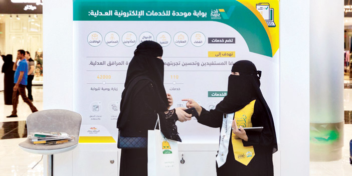 ويوجد في المعرض عدد من موظفات وزارة العدل المختصات في الشريعة والقانون والاجتماع، اللاتي يقمن باستقبال الزائرات، ويعرِّفن بالإجراءات والأنظمة المعمول بها في قطاع العدالة لتمكين المرأة من حقوقها الشرعية والقانونية دون أي عوائق. كما تربط الموظفات زائرات المعرض بالمنصات العدلية التي توفر العديد من الخدمات الإلكترونية والإرشادية للمستفيدات.
