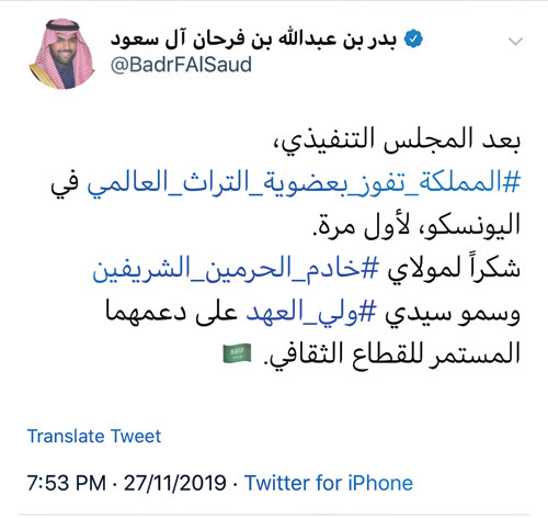 وعد صاحب السمو الأمير بدر بن عبد الله بن فرحان ، وزير الثقافة رئيس اللجنة الوطنية للتربية والعلوم والثقافة، انتخاب المملكة لعضوية لجنة التراث العالمي ترجمة لما يحظى به القطاع الثقافي من دعم لا محدود من خادم الحرمين الشريفين الملك سلمان بن عبد العزيز آل سعود، وصاحب السمو الملكي الأمير محمد بن سلمان بن عبد العزيز، ولي العهد نائب رئيس مجلس الوزراء وزير الدفاع، وتأكيداً لثقة المجتمع الدولي بمكانة المملكة ودورها الداعم لجهود حفظ التراث العالمي وصونه.