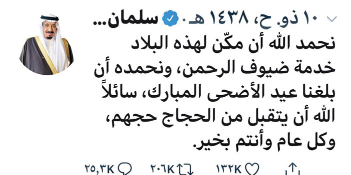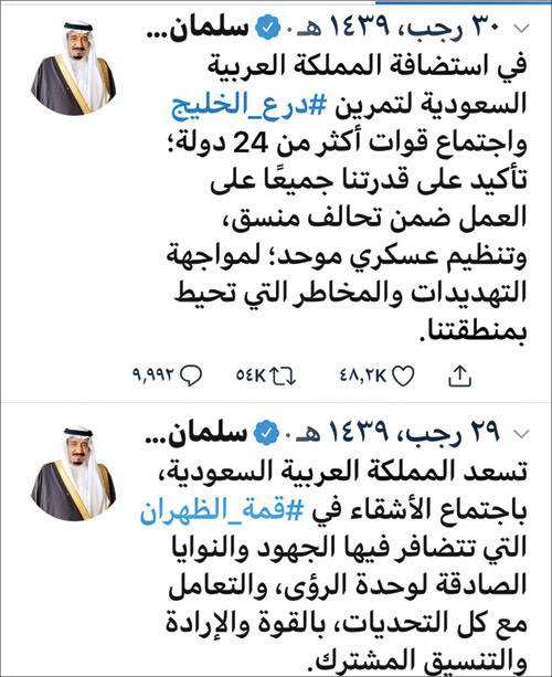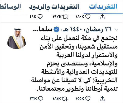 - نجتمع في مكة لنعمل على بناء مستقبل شعوبنا، وتحقيق الأمن والاستقرار لدولنا العربية والإسلامية، وسنتصدى بحزم للتهديدات العدوانية والأنشطة التخريبية؛ كي لا تعيقنا عن مواصلة تنمية أوطاننا وتطوير مجتمعاتنا». وقد أعيدت هذه التغريدة من قبل حوالي 181.397 من المتابعين.