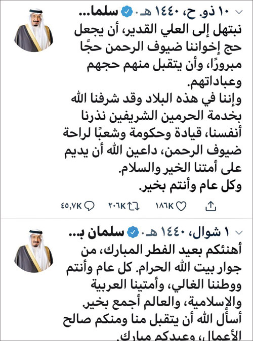 وفي 23 يونيو 2019م عند الساعة 9.10 ص نشر حساب الملك ما نصه: